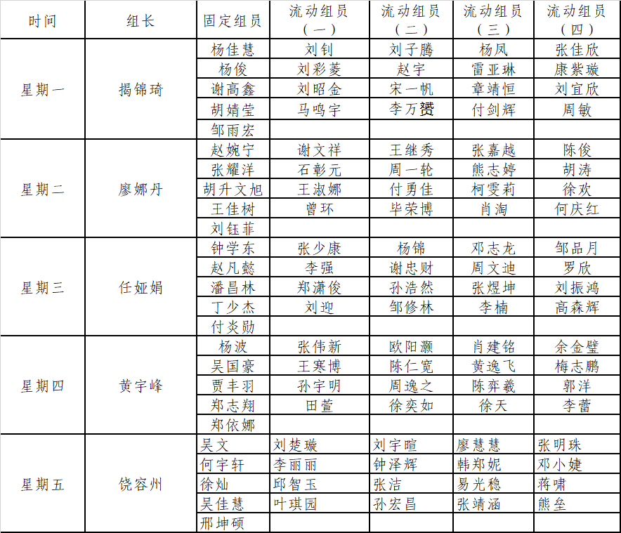 每组设立组长一名,负责统筹协调小组工作,定期向老师汇报工作进展。小组成员分成五个小组,每天安排一组进行监督工作,每组负责一天的课堂纪律监督任务。每个小组内部再进行具体分工。一个小组(组长+组员)共十人,四周一个周期循环。现将申博sunbet2024年秋季学期课堂纪律监督小组名单及安排公布如下。