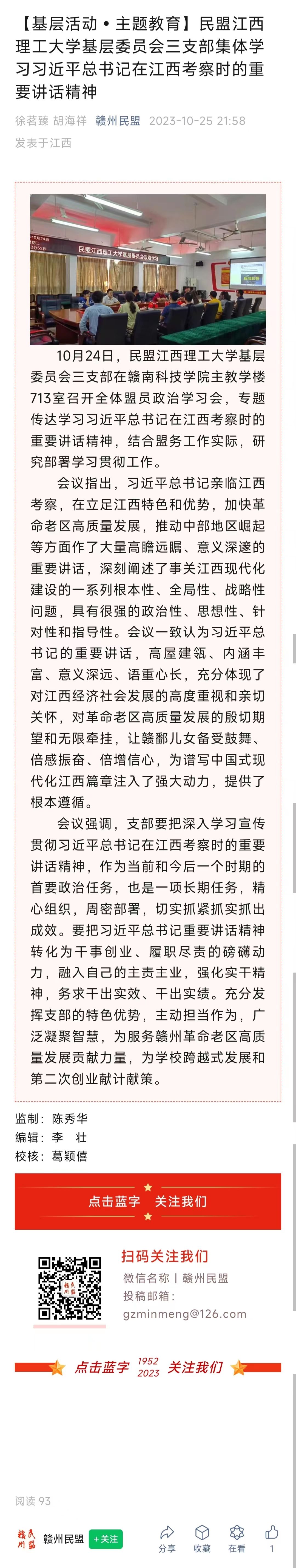 【赣州民盟】民盟江西理工大学基层委员会三支部集体学习习近平总书记在江西考察时的重要讲话精神
