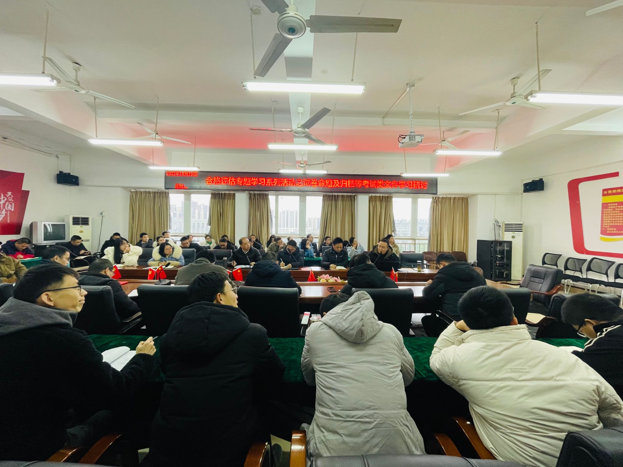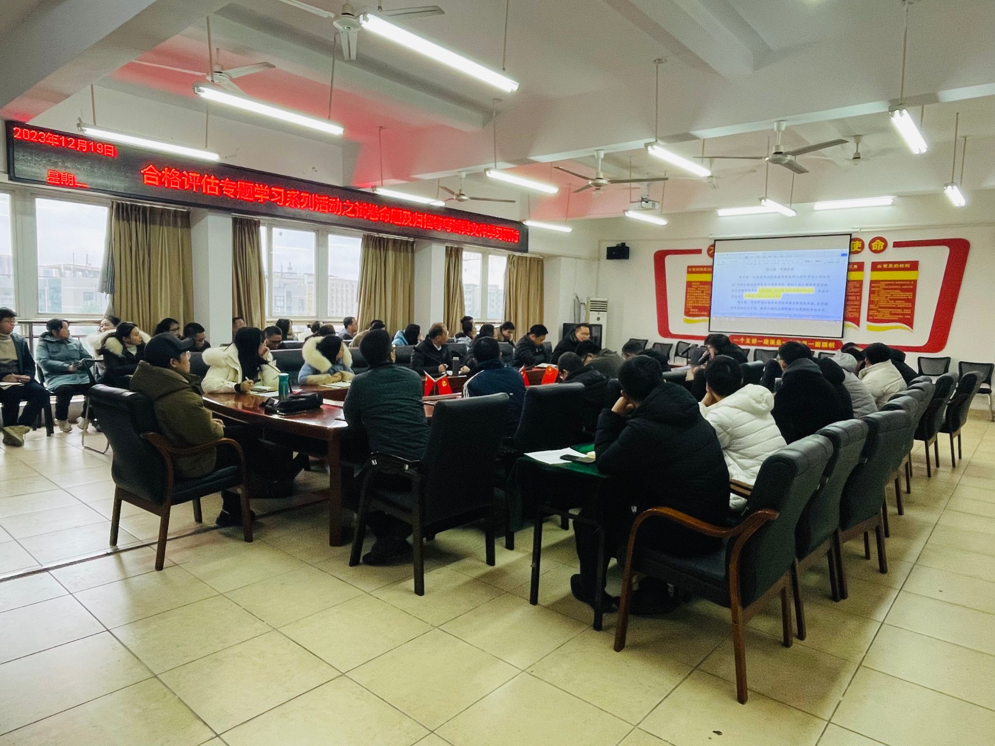 本网讯:2023年12月19日下午,建设工程系在主楼Z713会议室召开本科教学工作合格评估专题学习活动之试卷命题及归档等考试类文件学习研讨,建工系全体教职工参与本次学习,会议由代靖怡主持。