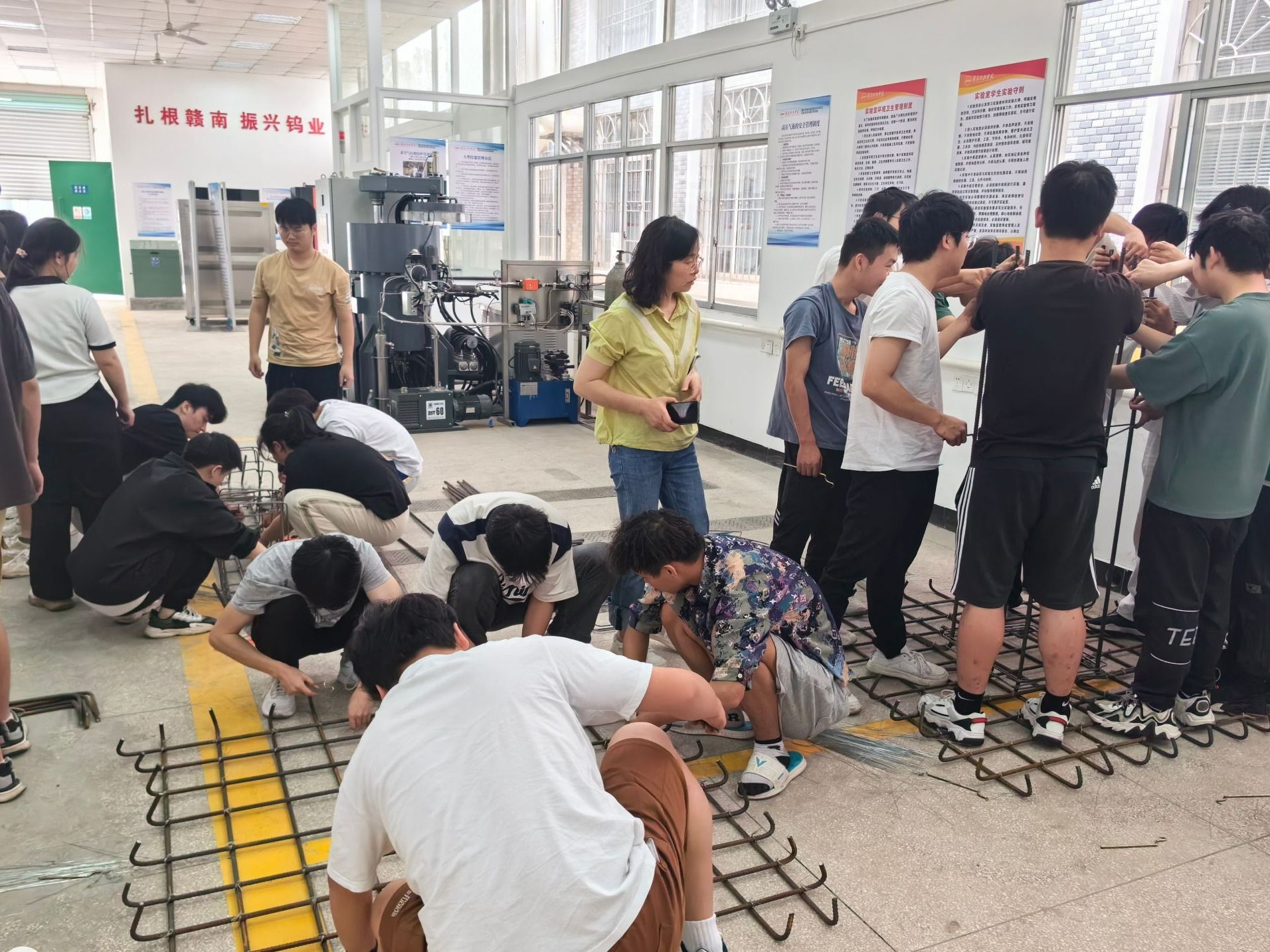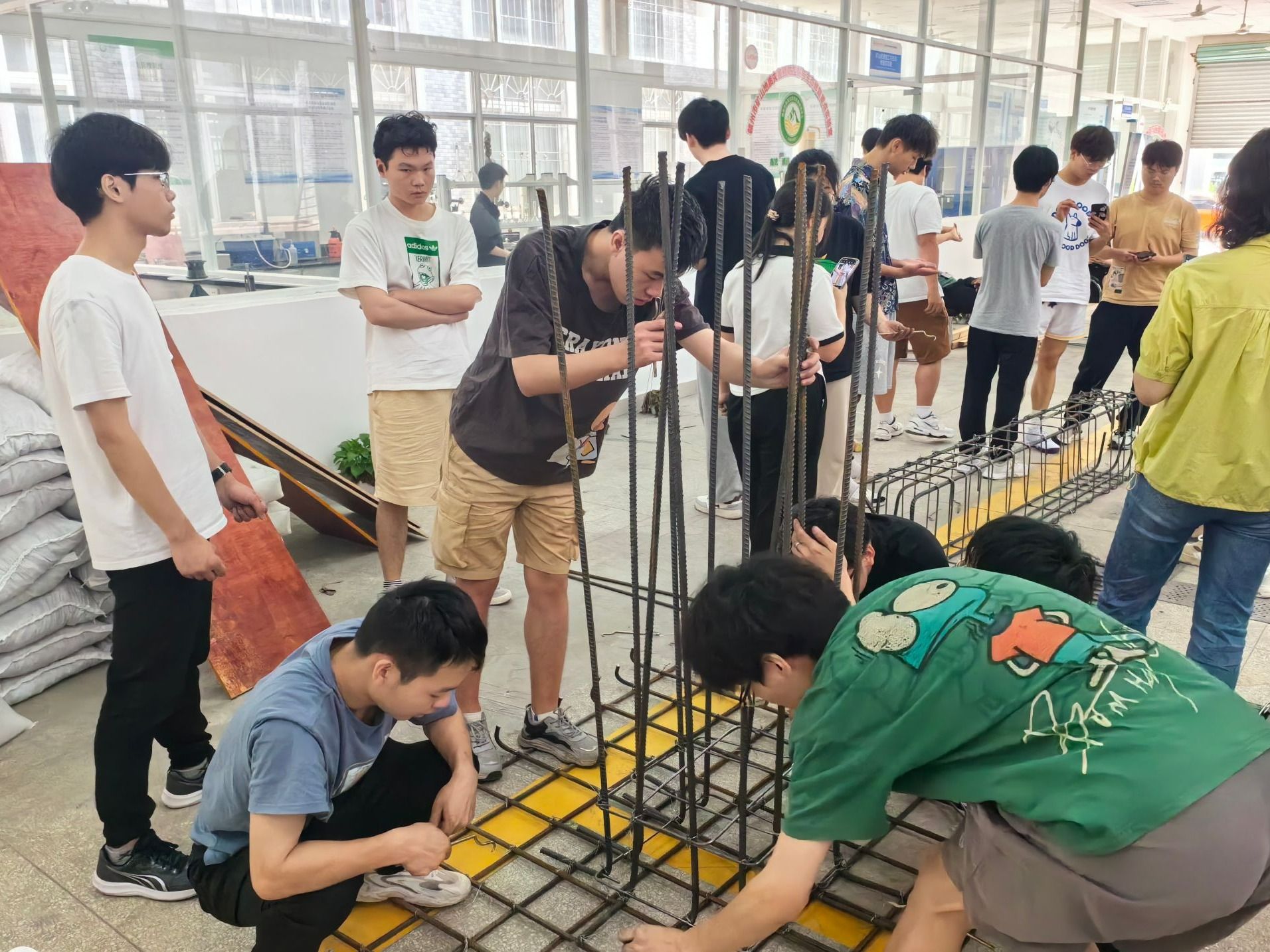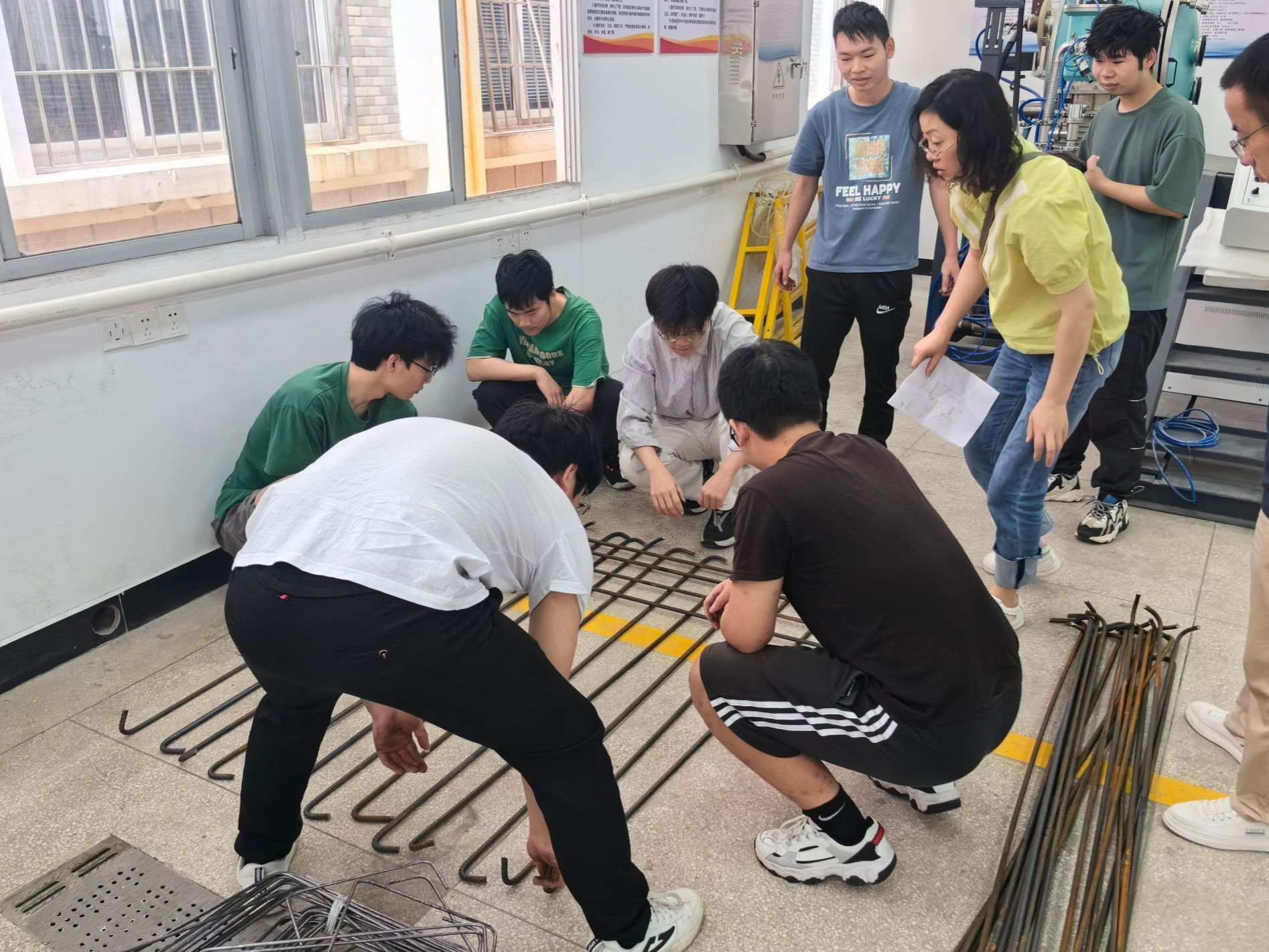 活动现场,共60余名员工们分成若干小组,在校内教师和企业工程师的共同指导下,有条不紊地开展钢筋制作、绑扎,以及混凝土搅拌和浇筑等工作。教师们耐心讲解每个步骤的要点和注意事项,确保员工们能够正确掌握操作技巧。企业工程师则结合自身丰富的工程实践经验,为员工们提供了宝贵的指导和建议。