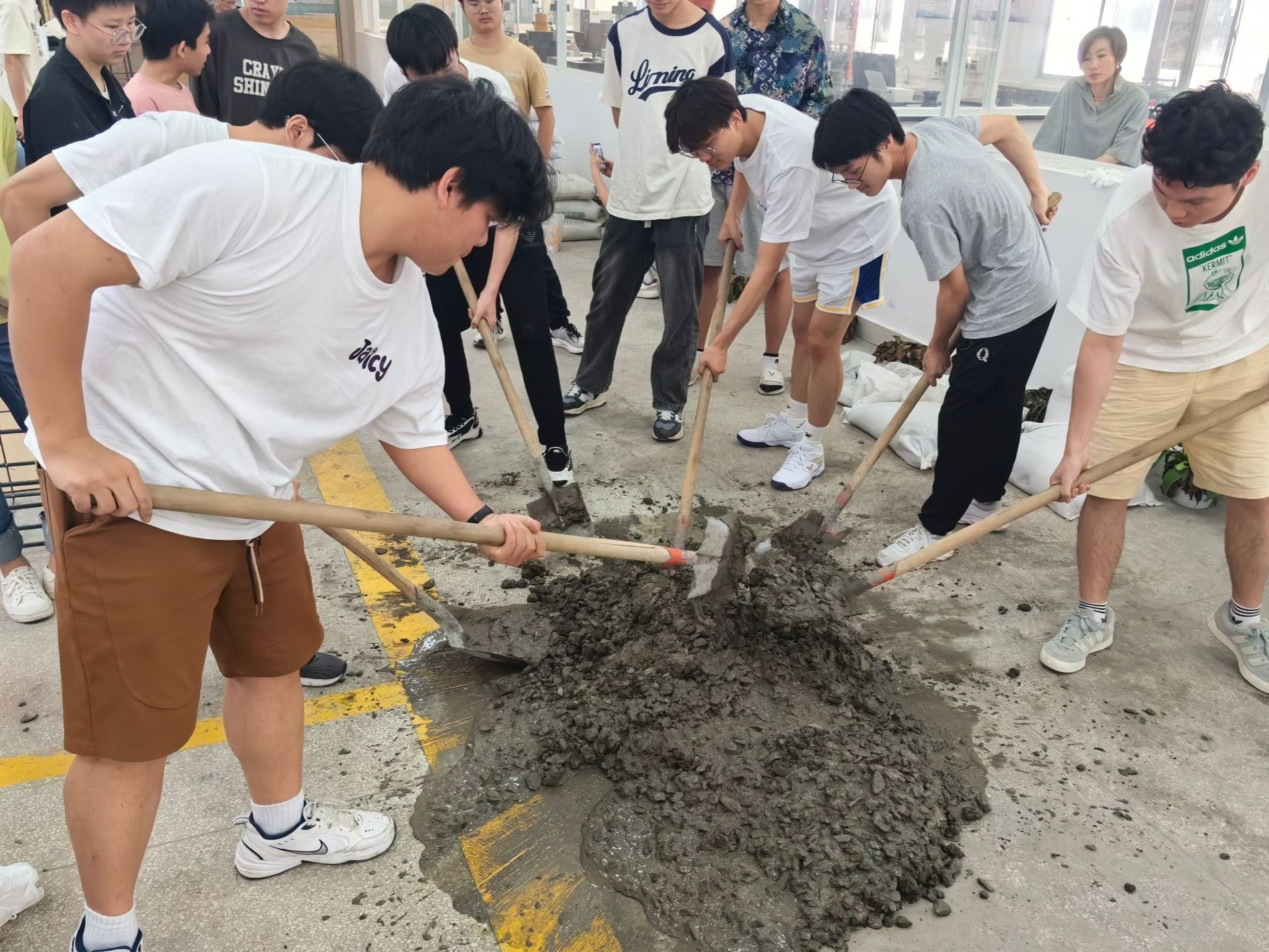 在混凝土搅拌环节,员工们在老师的指导下按照比例将水泥、砂、石等材料混合在一起,人工进行充分搅拌,制备出合格的混凝土。最后,在浇筑环节,员工们将混凝土倒入钢筋骨架中,用振动棒进行振捣,确保混凝土能够充分填充并紧密结合。