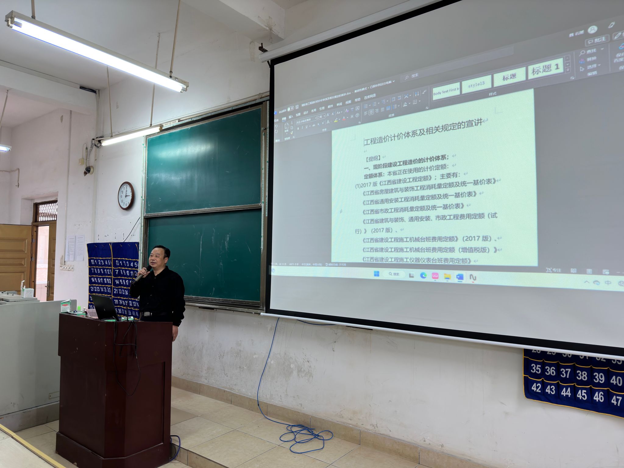 本网讯:为进一步加深工程造价专业员工对计价体系及相关考试条件的了解,建设工程系于3月11日在主教Z1D1举办工程造价计价专题宣讲会,会议邀请赣州市工程质量管理服务中心造价科科长、高级工程师钟效琼进行宣讲,我系造价专业员工参加本次会议,会议由建工系副主任代靖怡主持。
