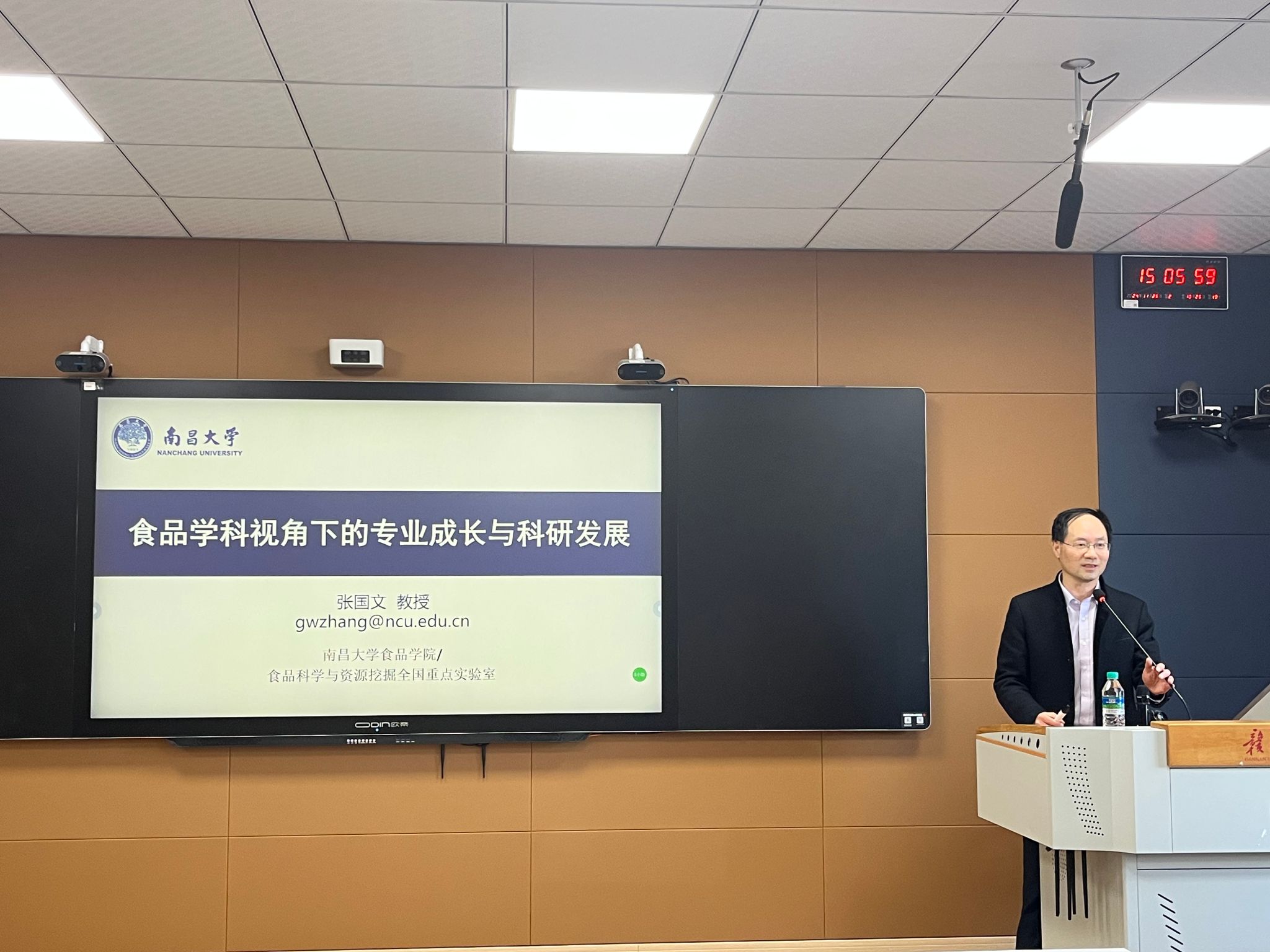 张国文教授就食品工业的现状与未来发展、食品学科员工的专业成长之路以及新进教师科研之路三个方面为大家进行了精彩的授课,赢得了现场师生的热烈掌声,老师和员工们表示意犹未尽,十分受益。