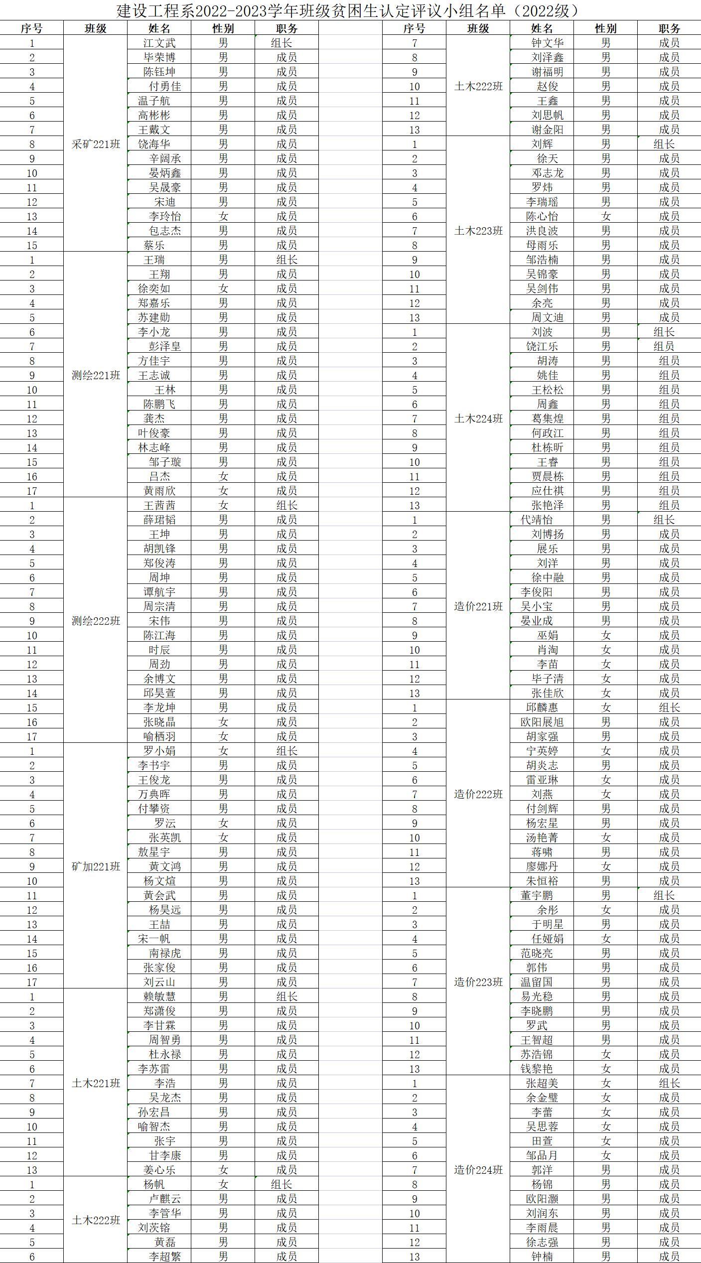 资源与建筑工程公司2022-2023学年21级—22级家庭经济困难员工认定评议小组成员名单公示: