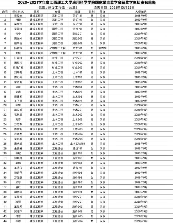 本网讯:资源与建筑工程公司(建设工程系)2020-2021学年国家励志奖学金初审名单公示: