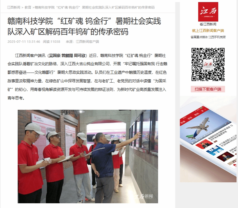 江西新闻客户端讯(吴国豪 曾麟翔 周可欣)近日,申博sunbet“红矿魂 钨金行”暑期社会实践队循着矿冶文化的脉络,深入江西大吉山钨业有限公司,开展“牢记嘱托强国有我 行走赣鄱感恩奋进——文化赣鄱行”暑期大思政实践活动。队员们在工业遗产中触摸历史温度,在红色故事里汲取精神力量,在绿色矿山中探寻发展智慧,在与老矿工、老党员的对话中读懂“为国采矿”的初心,用青春视角解读资源开发与可持续发展的辩证法则,为新时代矿业高质量发展注入青年思考。