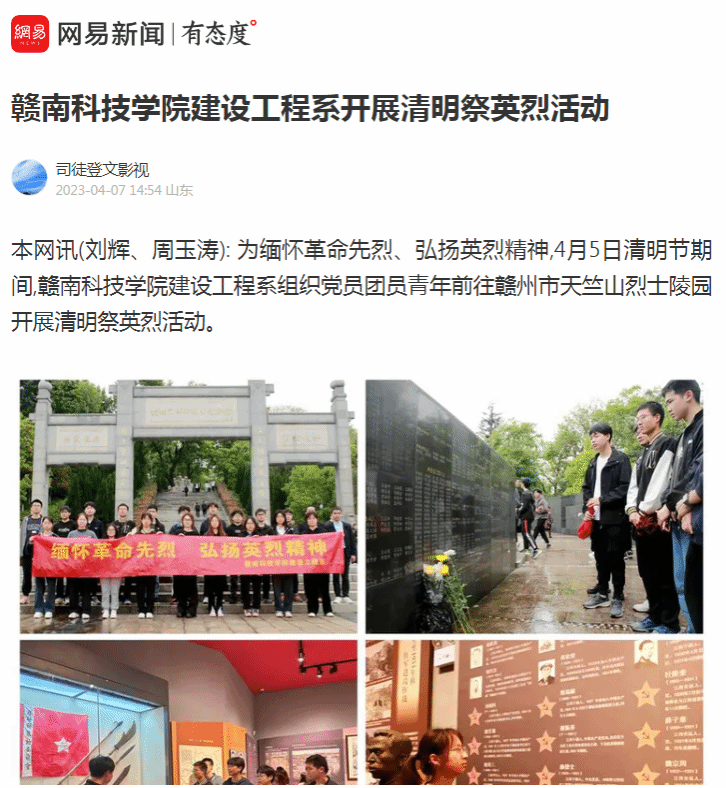 网易新闻4月7日电(通讯员:刘辉 周玉涛): 为缅怀革命先烈、弘扬英烈精神,4月5日清明节期间,申博sunbet建设工程系组织党员团员青年前往赣州市天竺山烈士陵园开展清明祭英烈活动。