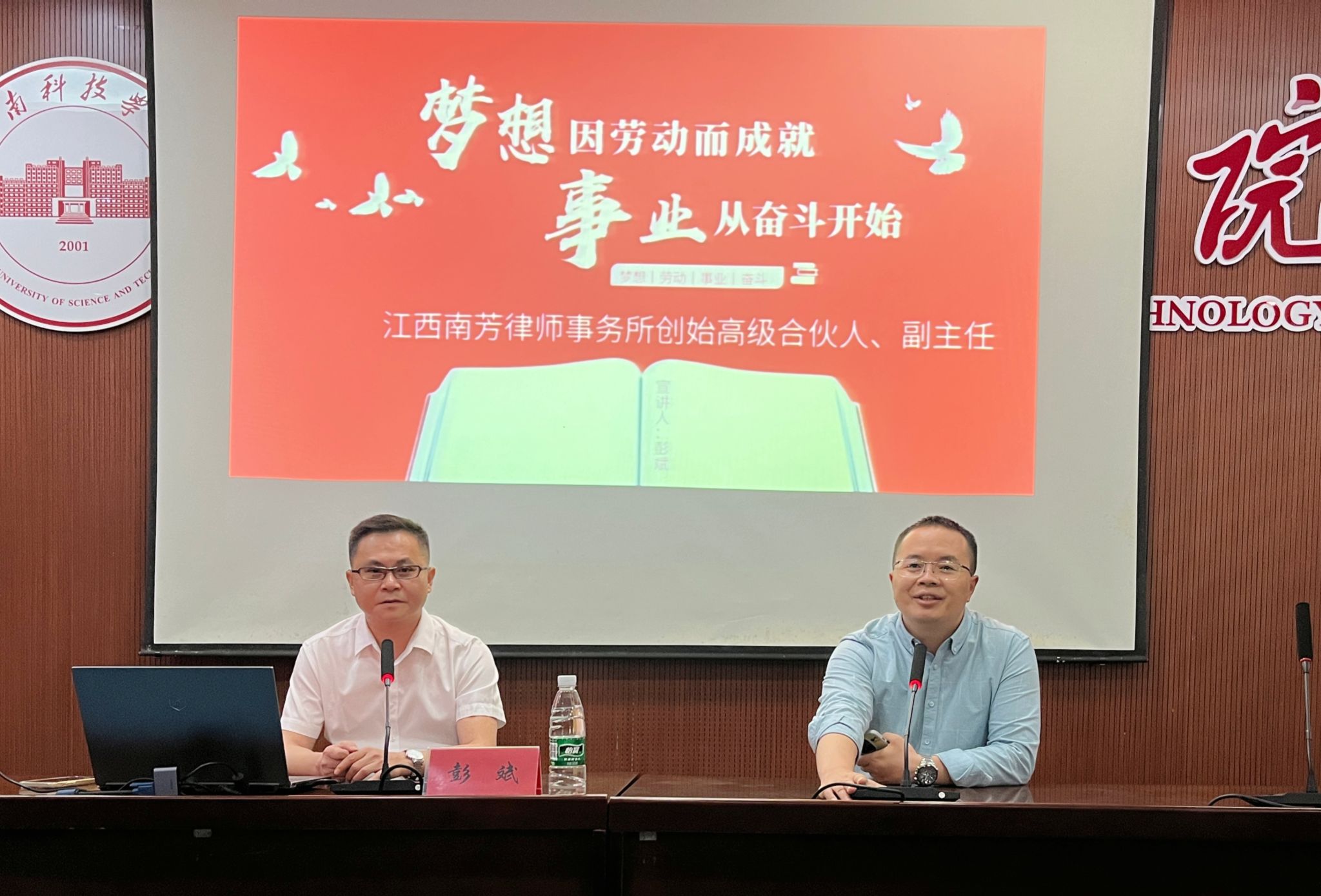 本网讯:为增强员工的劳动意识,培养劳动实践技能,5月23日下午,由校团委主办,建设工程系承办的以“梦想因劳动而成就,事业从奋斗开始”为主题的第94期金沙湾讲坛于2号教学楼MBA学术报告厅开展。江西南芳律师事务所创始高级合伙人、副主任彭斌受邀来到公司讲座授课,建设工程系两百多名员工参加此次讲座。