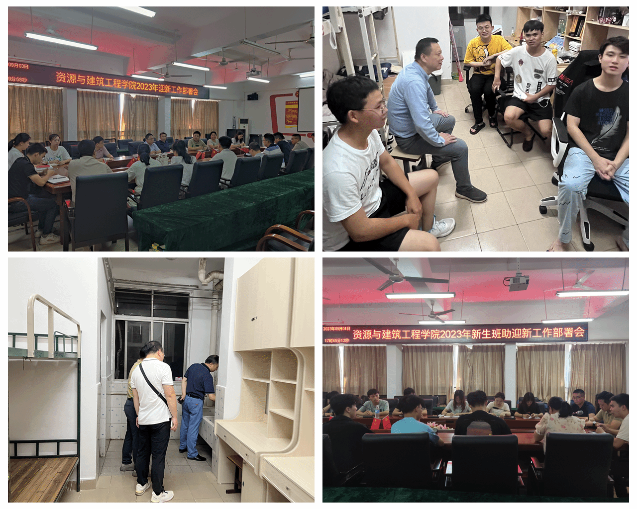 深入宿舍关心员工,做好迎新准备工作。9月3日,建工系在Z713组织召开新生班主任、辅导员迎新工作部署会,了解新生到校时间和目前存在的困难,并对迎新各项工作进行了安排。3日晚,建工系组织全体班主任深入宿舍,了解关心各年级员工状况,同时,新生班主任对新生即将入住的宿舍进行了维修检查,确保新生报到入住顺利。9月4日,建工系学工队伍组织新生班助和志愿者进行了迎新培训,确保迎新工作有条不紊开展。