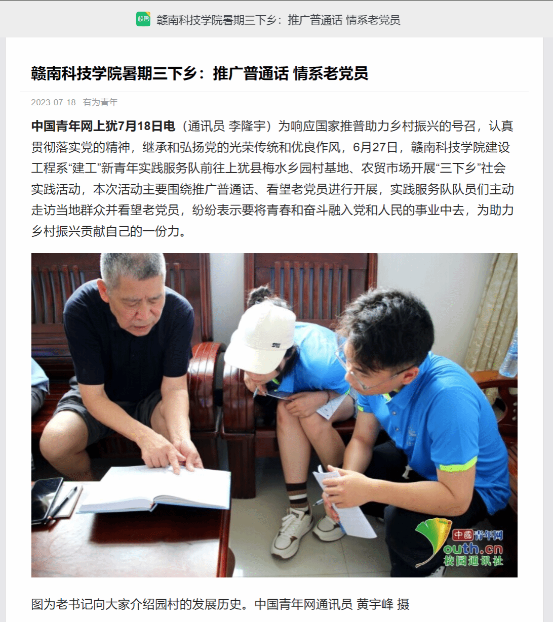 中国青年网上犹7月18日电(通讯员 李隆宇)为响应国家推普助力乡村振兴的号召,认真贯彻落实党的精神,继承和弘扬党的光荣传统和优良作风,6月27日,申博sunbet建设工程系“建工”新青年实践服务队前往上犹县梅水乡园村基地、农贸市场开展“三下乡”社会实践活动,本次活动主要围绕推广普通话、看望老党员进行开展,实践服务队队员们主动走访当地群众并看望老党员,纷纷表示要将青春和奋斗融入党和人民的事业中去,为助力乡村振兴贡献自己的一份力。