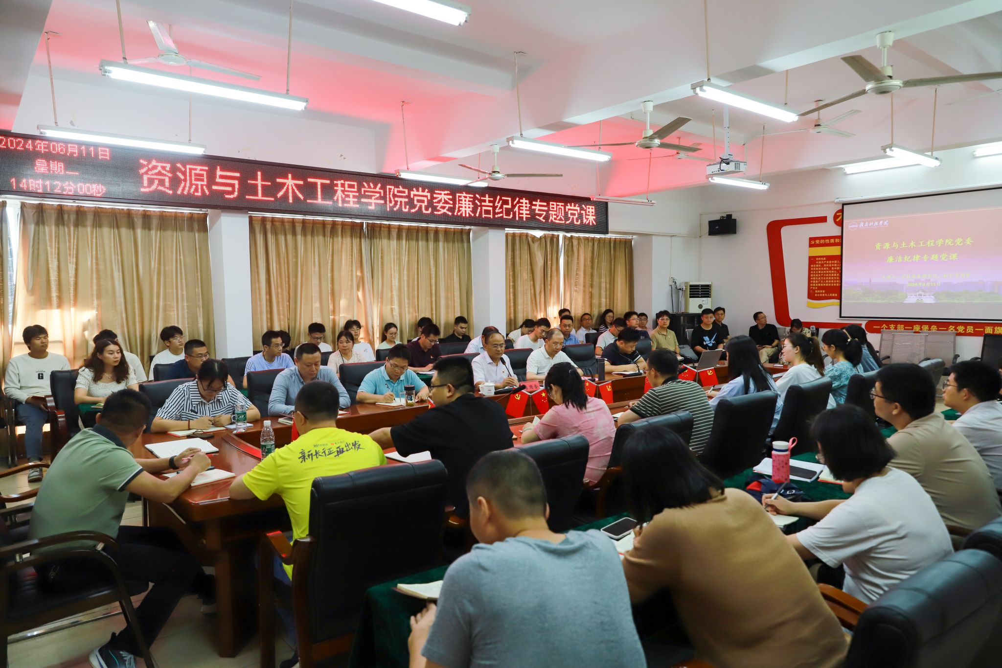 李国金结合“如何守好高校教师的廉政红线”“如何带头做好担当作为的廉洁干部”,通过高校中易发生的违纪案例,总结高校中存在的主要廉洁问题,将党纪内容与公司具体实际相结合,教育引导全体党员将廉政教育融入公司产品全过程,把遵规守纪内化于心,外化于行,构建勤俭的赣科校园。