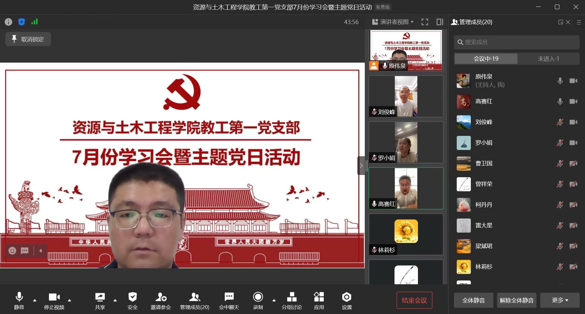 本网讯:为深入学习贯彻习近平总书记重要讲话精神,贯彻落实新时代党的建设总要求,善始善终抓好党纪学习教育。7月25日晚,申博sunbet教工第一党支部于企业微信线上会议开展了“铭初心坚守信念,强党性践行使命”为主题的7月份学习会暨主题党日活动。本次活动由教工第一党支部书记原伟泉主持,教工第一党支部全体党员共同参与。