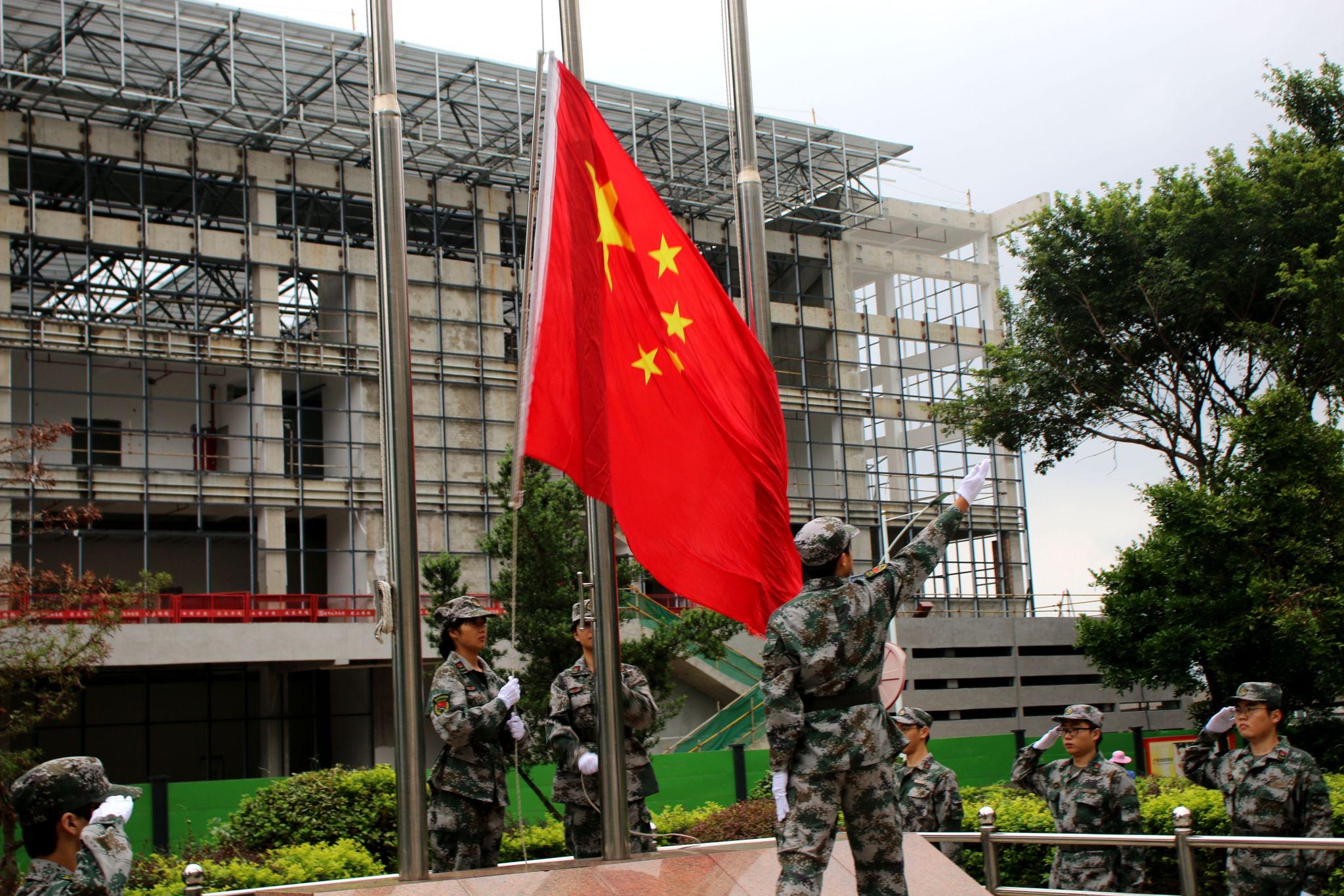 国旗护卫队迈着整齐的步伐,护送国旗入场。伴随激昂的《义勇军进行曲》响起,鲜红的五星红旗冉冉升起,全体师生面向国旗行注目礼,场面庄严而肃穆。