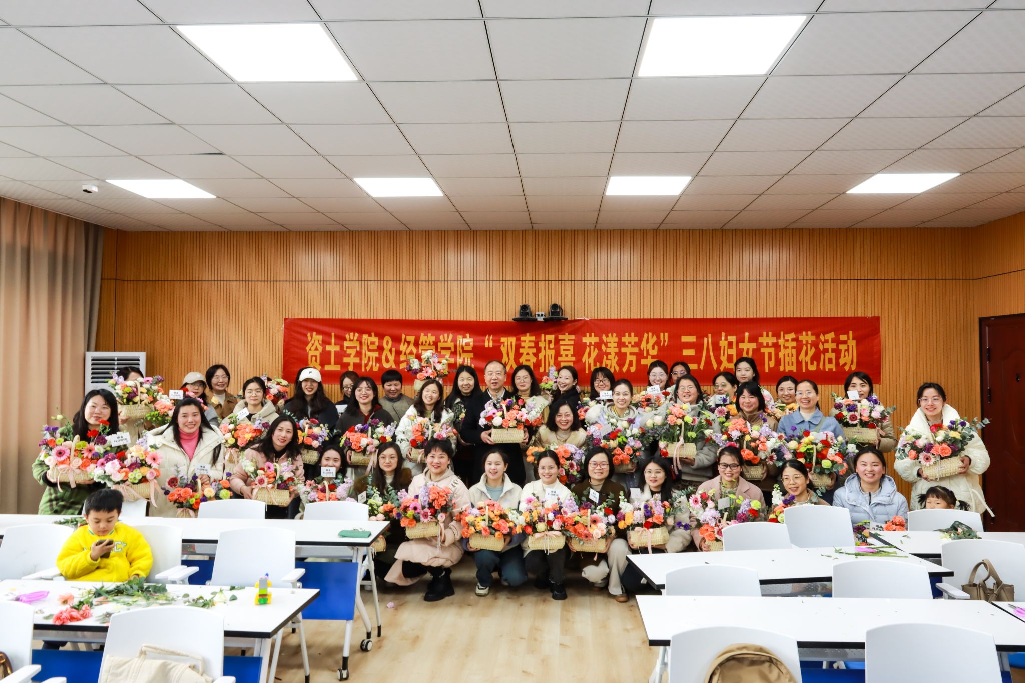 本网讯:三月芳菲始,巾帼绽芳华,为庆祝第115个“三八”国际劳动妇女节,3月8日上午,申博sunbet联合经济管理公司在智慧教室Z628举办了“双春报喜 花漾芳华”三八妇女节主题插花活动,以花之名向全院女教职工致以节日祝福。