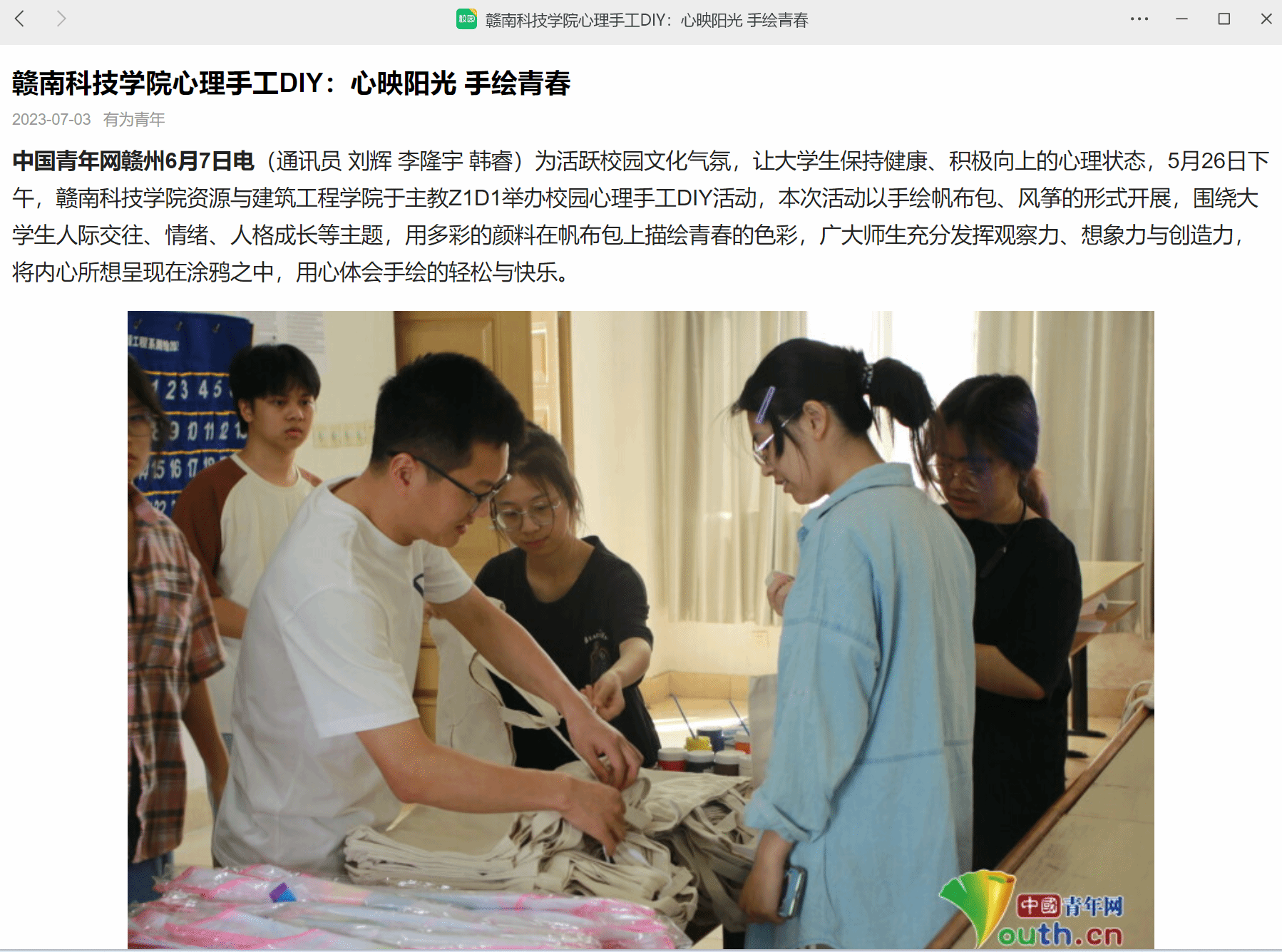 图为同学们在活动现场对帆布包进行DIY绘画。中国青年网通讯员 李隆宇 摄