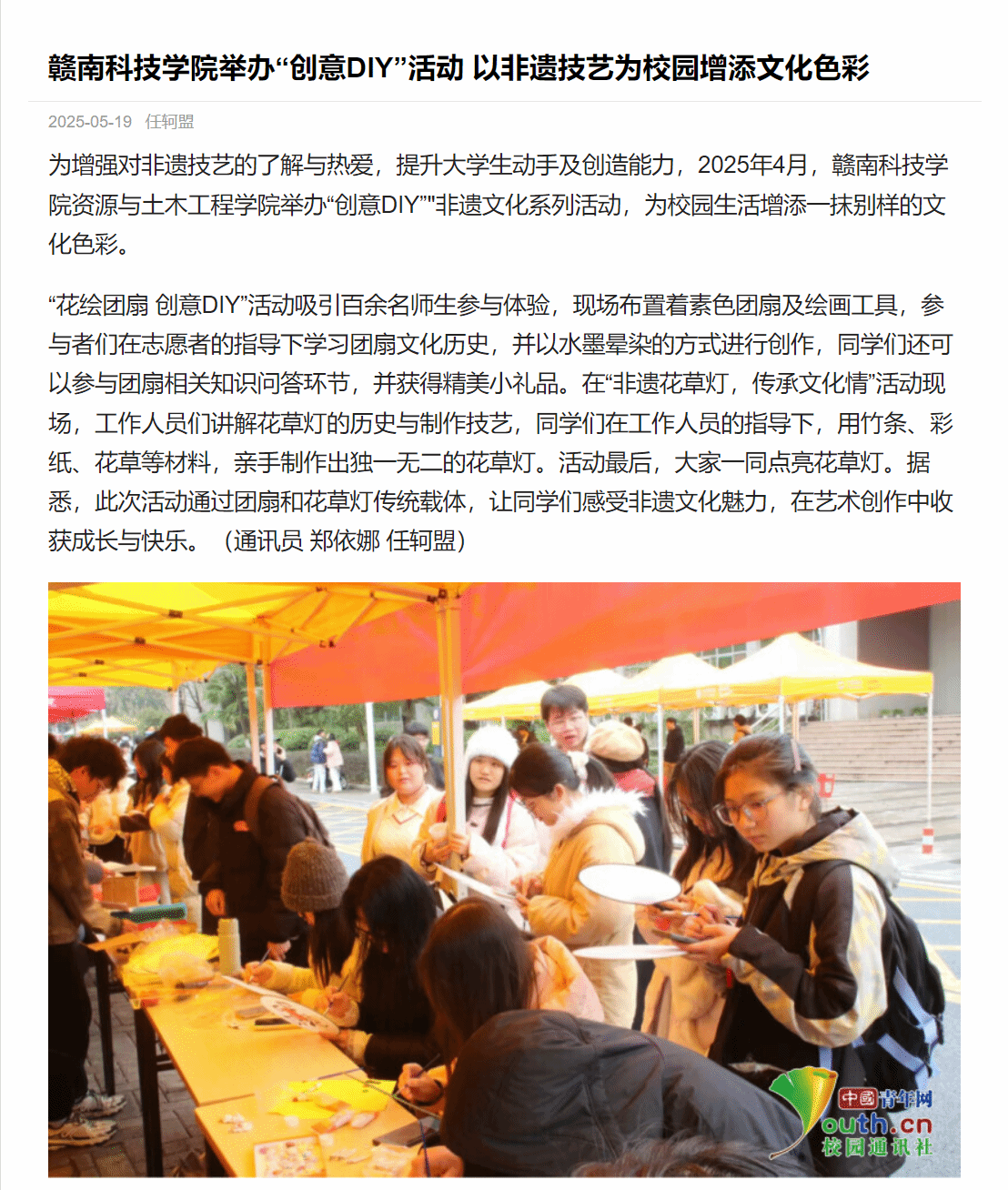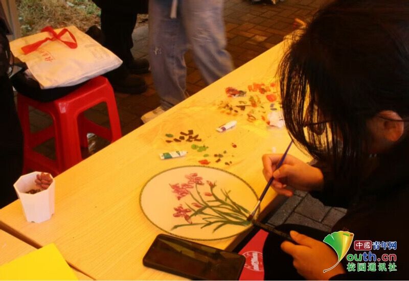 “花绘团扇 创意DIY”活动吸引百余名师生参与体验,现场布置着素色团扇及绘画工具,参与者们在志愿者的指导下学习团扇文化历史,并以水墨晕染的方式进行创作,同学们还可以参与团扇相关知识问答环节,并获得精美小礼品。在“非遗花草灯,传承文化情”活动现场,工作人员们讲解花草灯的历史与制作技艺,同学们在工作人员的指导下,用竹条、彩纸、花草等材料,亲手制作出独一无二的花草灯。活动最后,大家一同点亮花草灯。据悉,此次活动通过团扇和花草灯传统载体,让同学们感受非遗文化魅力,在艺术创作中收获成长与快乐。(通讯员 郑依娜 任轲盟)