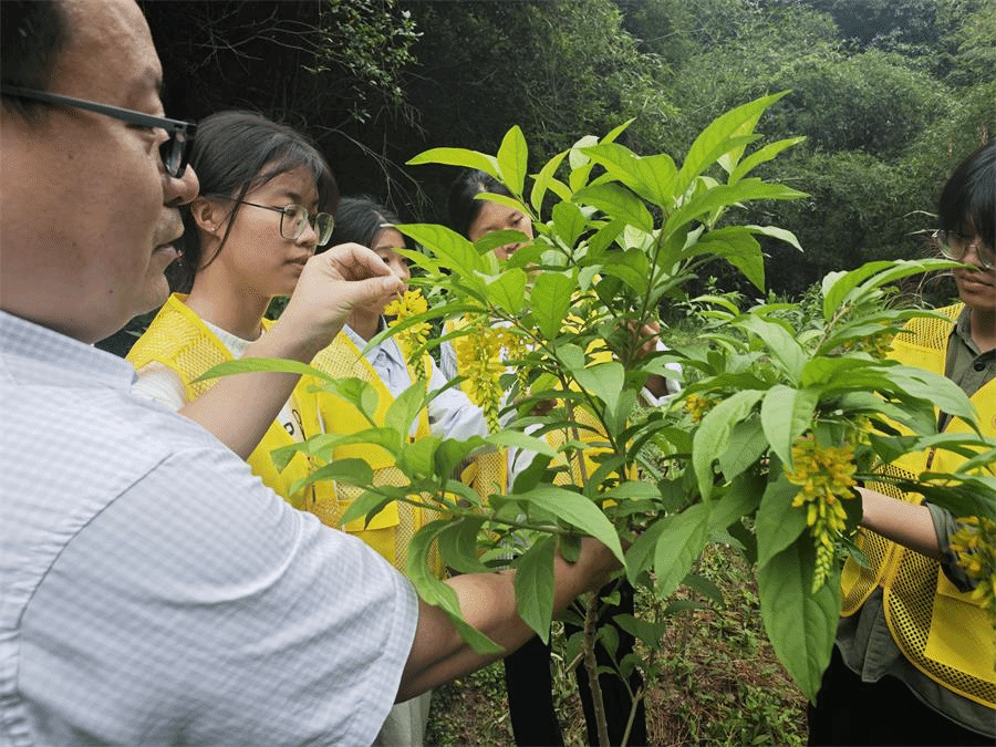 黄花倒水莲,在客家传统医药文化中占据着举足轻重的地位,其根、叶皆可入药,常被用于治疗病后体虚、腰膝酸痛等多种病症,是客家人世代相传、信赖有加的天然良药。在参观学习期间,师生们实地考察了紫芝山房的黄花倒水莲仿野生种植基地,认真了解并学习黄花倒水莲仿野生种植的优势及技术要点,一同参与到黄花倒水莲“打顶”增产等田间管理实践操作中。通过亲身体验,师生们对黄花倒水莲的种植有了更直观、更深入的认识。