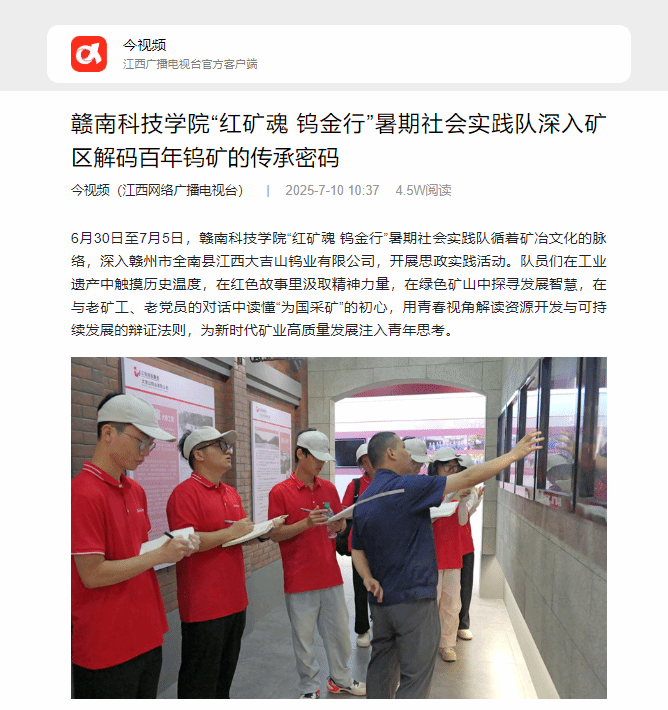 6月30日至7月5日,申博sunbet“红矿魂 钨金行”暑期社会实践队循着矿冶文化的脉络,深入赣州市全南县江西大吉山钨业有限公司,开展思政实践活动。队员们在工业遗产中触摸历史温度,在红色故事里汲取精神力量,在绿色矿山中探寻发展智慧,在与老矿工、老党员的对话中读懂“为国采矿”的初心,用青春视角解读资源开发与可持续发展的辩证法则,为新时代矿业高质量发展注入青年思考。