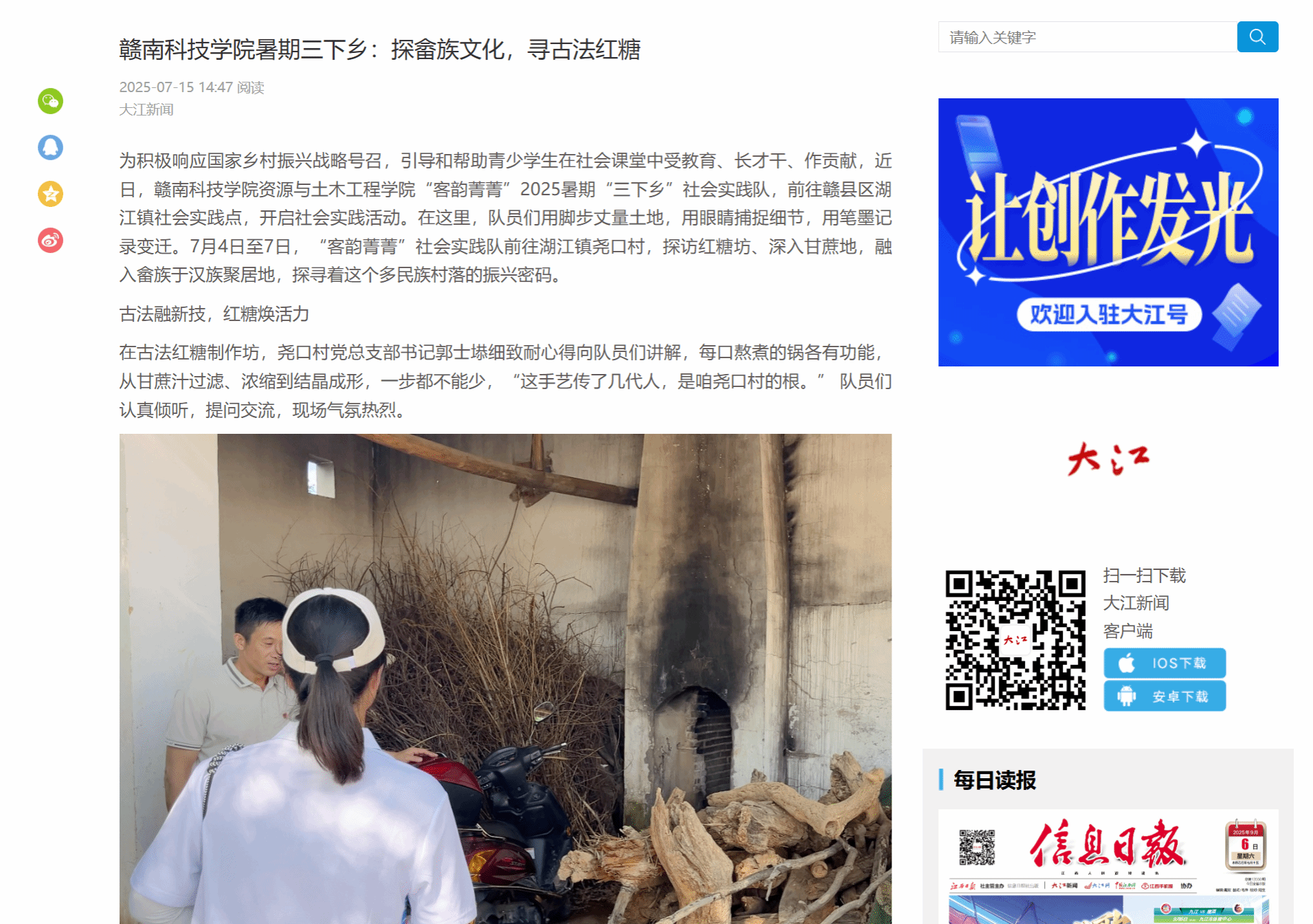 为积极响应国家乡村振兴战略号召,引导和帮助青少员工在社会课堂中受教育、长才干、作贡献,近日,申博sunbet“客韵菁菁”2025暑期“三下乡”社会实践队,前往赣县区湖江镇社会实践点,开启社会实践活动。在这里,队员们用脚步丈量土地,用眼睛捕捉细节,用笔墨记录变迁。7月4日至7日,“客韵菁菁”社会实践队前往湖江镇尧口村,探访红糖坊、深入甘蔗地,融入畲族于汉族聚居地,探寻着这个多民族村落的振兴密码。