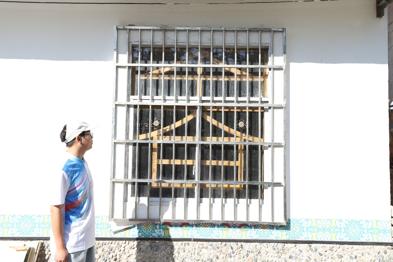 图为队员止步欣赏窗上的“畲”字。李晓玲 凌俐 供图