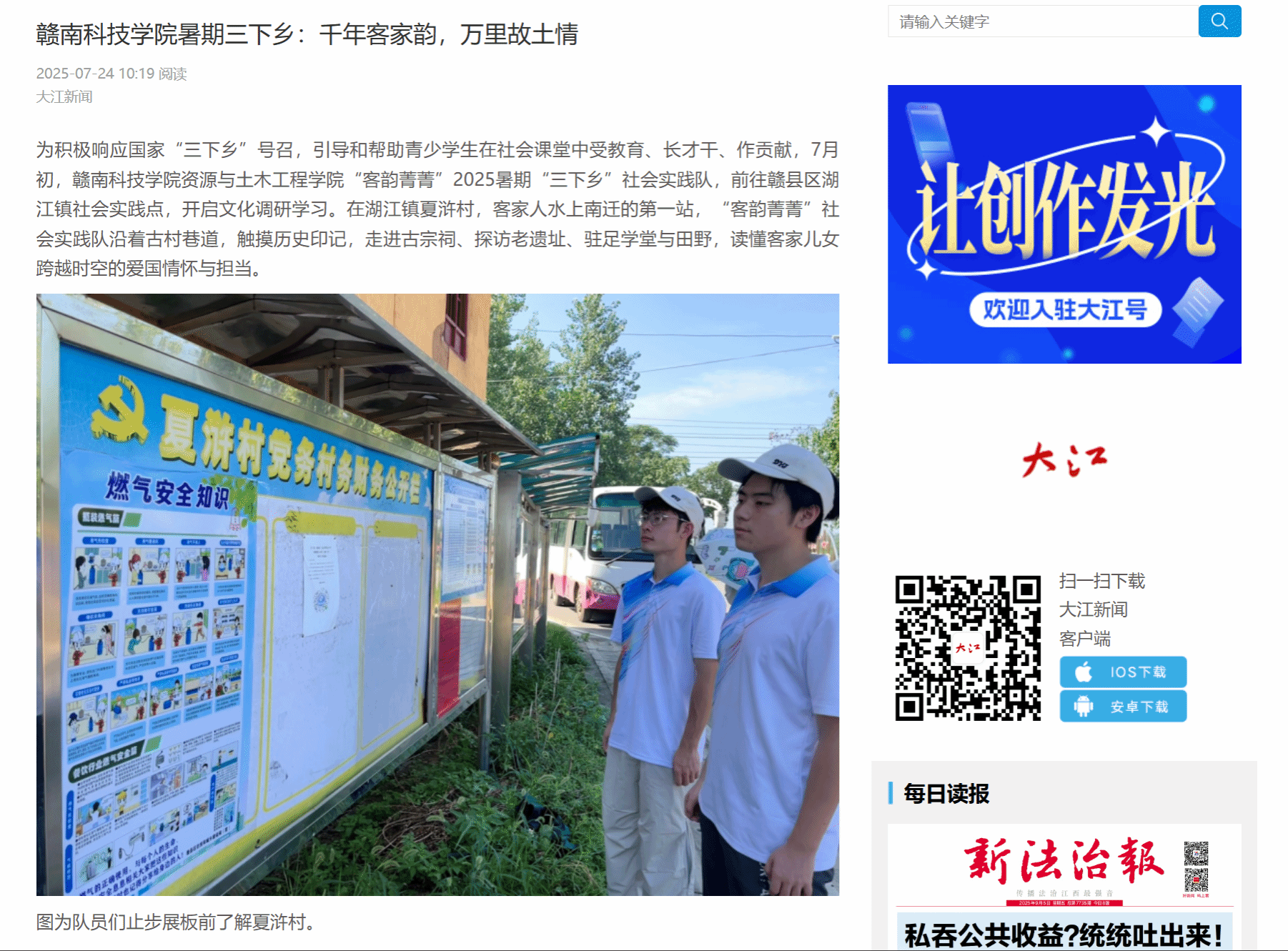 为积极响应国家“三下乡”号召,引导和帮助青少员工在社会课堂中受教育、长才干、作贡献,7月初,申博sunbet“客韵菁菁”2025暑期“三下乡”社会实践队,前往赣县区湖江镇社会实践点,开启文化调研学习。在湖江镇夏浒村,客家人水上南迁的第一站,“客韵菁菁”社会实践队沿着古村巷道,触摸历史印记,走进古宗祠、探访老遗址、驻足学堂与田野,读懂客家儿女跨越时空的爱国情怀与担当。