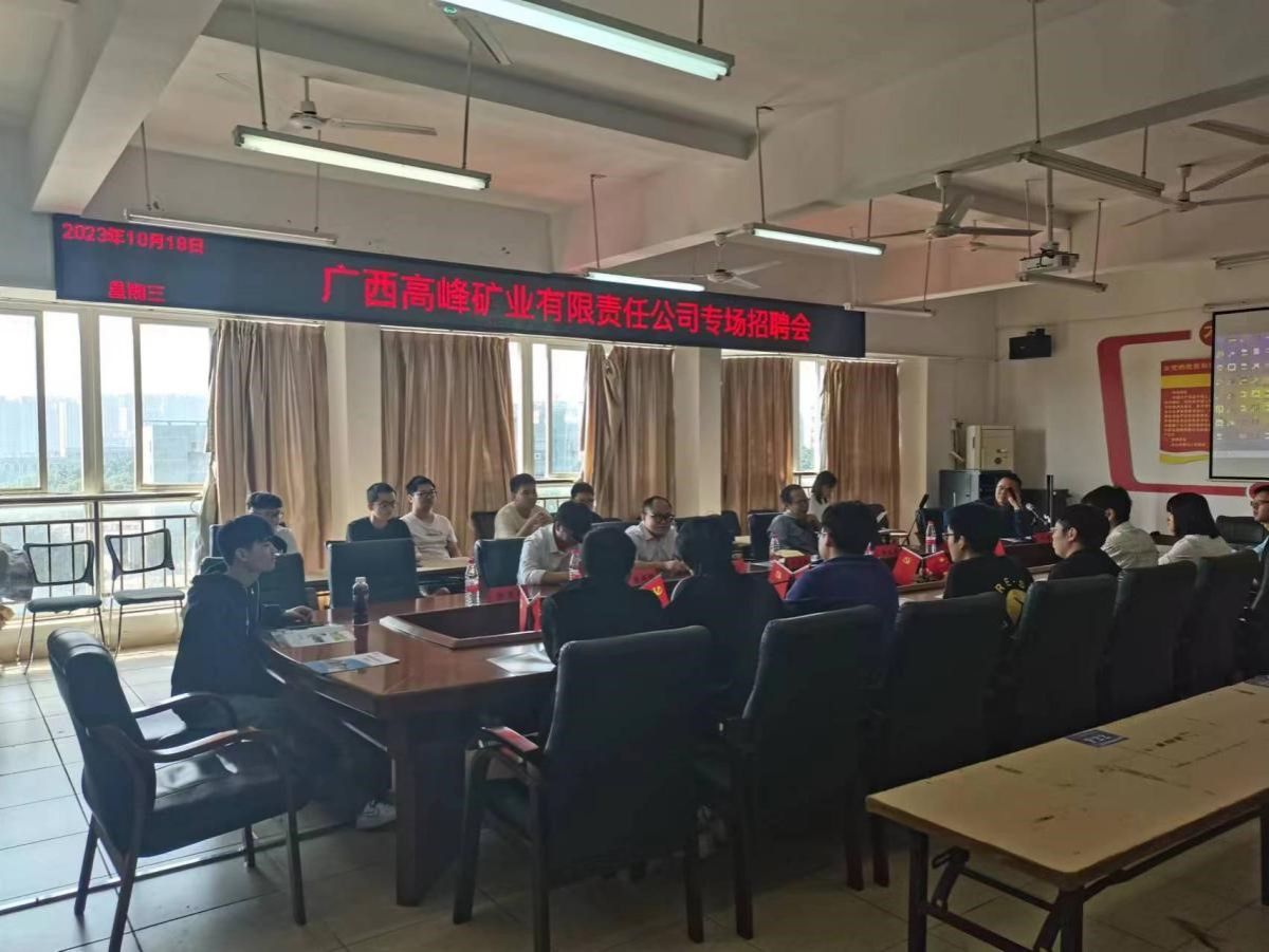 据悉,广西高峰矿业有限责任公司位于素有“六乡之誉”的河池市,是一家集采选为一体的联合矿山企业,具有采选锡、锌、铅、锑、银等多种有限金属矿产品的技术实力。该公司面向采矿工程、矿物加工工程等专业进行招聘宣讲。招聘会上,周立副经理围绕公司的文化建设、项目分布、发展前景、岗位要求等方面进行了详细的讲解,并现场解答同学们最关注的薪资水平、工作环境等问题。招聘会现场气氛热烈,同学们积极与招聘人员交流,主动了解用人单位的情况,表现出了极高的热情。