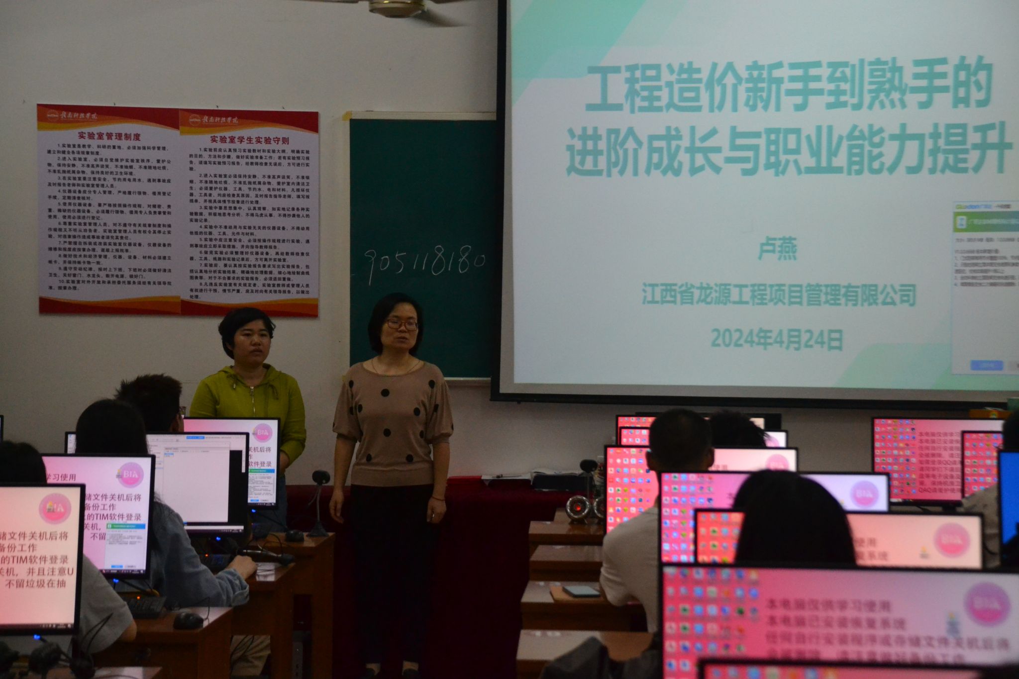 本网讯:4月24日晚,一场主题为“工程造价新手到熟手的进阶成长与职业能力提升”的校企合作讲座在工程研究院S607隆重举行。此次企业专家进校园讲座有幸邀请到江西省龙源工程项目管理有限公司造价中心副主任卢燕作为主讲嘉宾,讲座由申博sunbet工程造价教研室副主任林莉杉老师主持,吸引了众多工程造价专业的员工积极参与。
