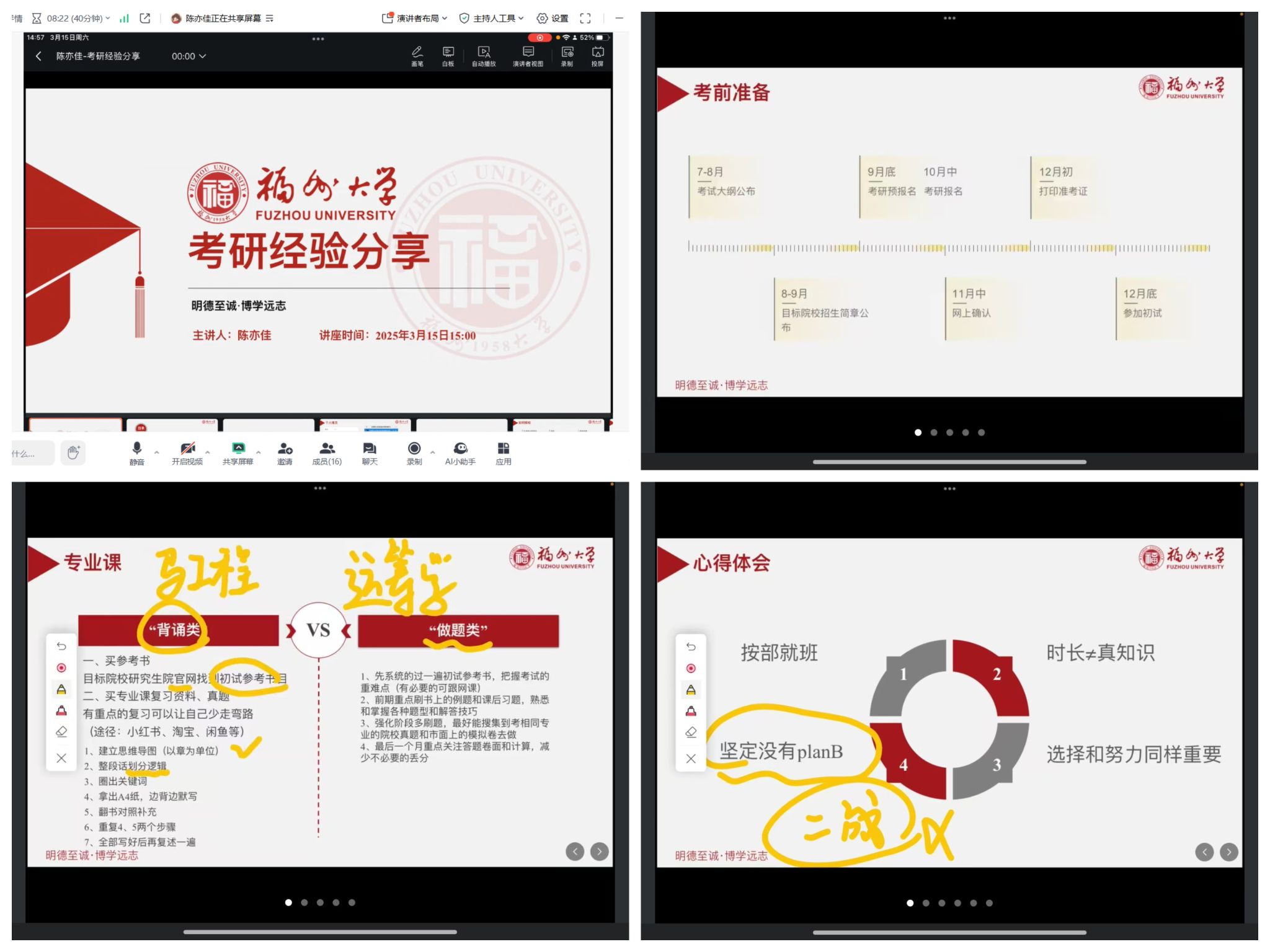 讲座特邀2024届成功考入福州大学的陈亦佳员工担任主讲嘉宾。陈亦佳员工结合自身考研经历,从院校选择、备考规划、心态调整三个关键维度,进行了系统且深入的解析。在院校选择方面,她着重强调“专业优先”的原则,建议同学们结合自身兴趣与长远职业规划,精准锁定目标院校。同时,还应借助报录比、专业研究方向等数据,对院校的综合竞争力进行理性评估。在备考规划上,她针对不同科目提出了极具针对性的策略:政治备考需遵循“阶段式突破”的节奏,稳步推进;英语学习要“以真题为核心”,通过反复钻研真题提升应试能力;数学复习应注重“强化概念理解与题型归纳总结”,夯实基础、提升解题技巧;专业课学习则要“深挖历年真题,广泛涉猎前沿专业资源”,全面掌握专业知识。谈及心态调整,她提醒学弟学妹们务必“拒绝盲目攀比学习进度”,通过制定弹性学习计划和适度放松,来保持良好的备考节奏,始终坚定“一战成硕”的信念。