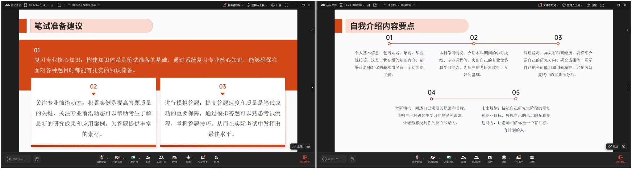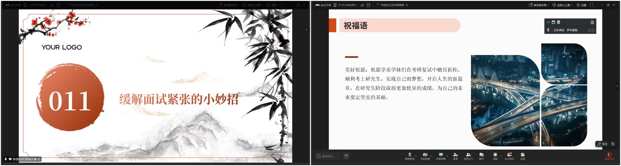 本网讯:为深入推进学风建设,全力帮助考研学子顺利通过复试,3月23日,申博sunbet借助线上平台举办考研复试指导交流会。本次会议由刘波老师主持,特别邀请了钟崇林、汤燕、左旭超三位在读研究生员工担任主讲嘉宾,为即将踏入复试考场的同学们倾囊相授复试经验。