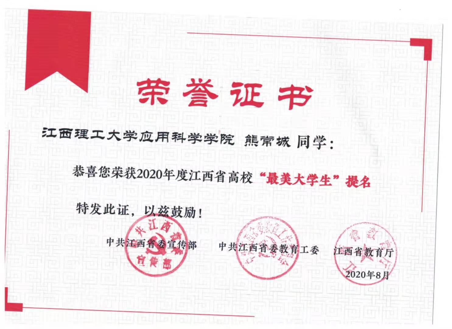 近日,公司建设工程系造价174班熊常城同学收获一份2020年度江西省高校“最美老员工”提名获奖证书。