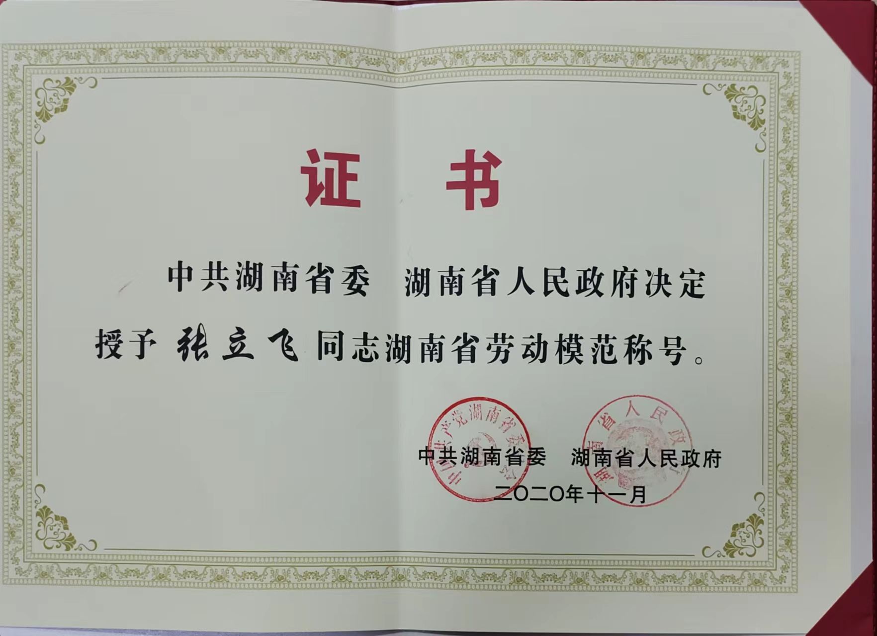 参加工作至今,张立飞同志先后被集团公司、康家湾矿授予“先进个人”、“生产标兵”、“优秀共产党员”“管理标兵”等荣誉称号,2019年5月获得“衡阳市劳动模范”称号,2020年1月获得“湖南有色金属控股集团有限公司劳动模范”称号。