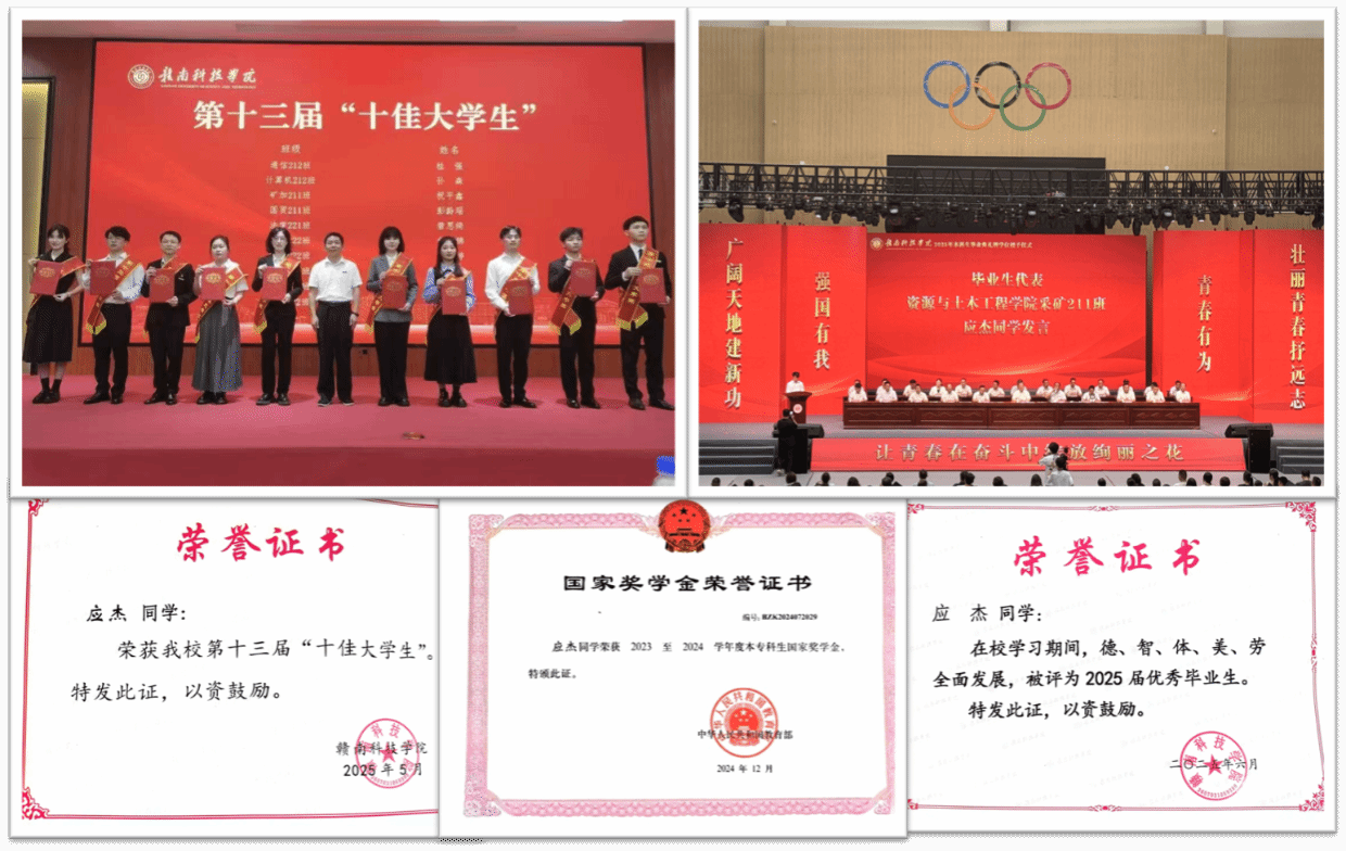 在考研备考的过程中,应杰不仅自己努力备考各科目,还积极主动为同学们答疑解惑、分享备考经验。他常说:“党员不仅要自己积极进取,同时也要带动身边的人一起前进。”最终他以总分第二的成绩考取北京科技大学硕士研究生。从金沙湾到满井园,从赣科到北科,他始终记得那些在图书馆背书的清晨、在自习室演算的深夜,都因背后有家国情怀提供的强大精神力量——它们像无声的锚点,让追梦的船没有因困境压力偏离航向。未来,他将延续采矿人的精神,把论文写在祖国的大好河山。